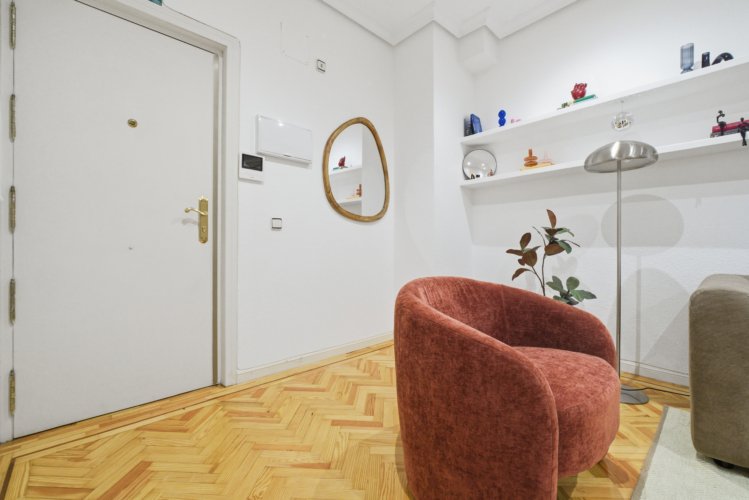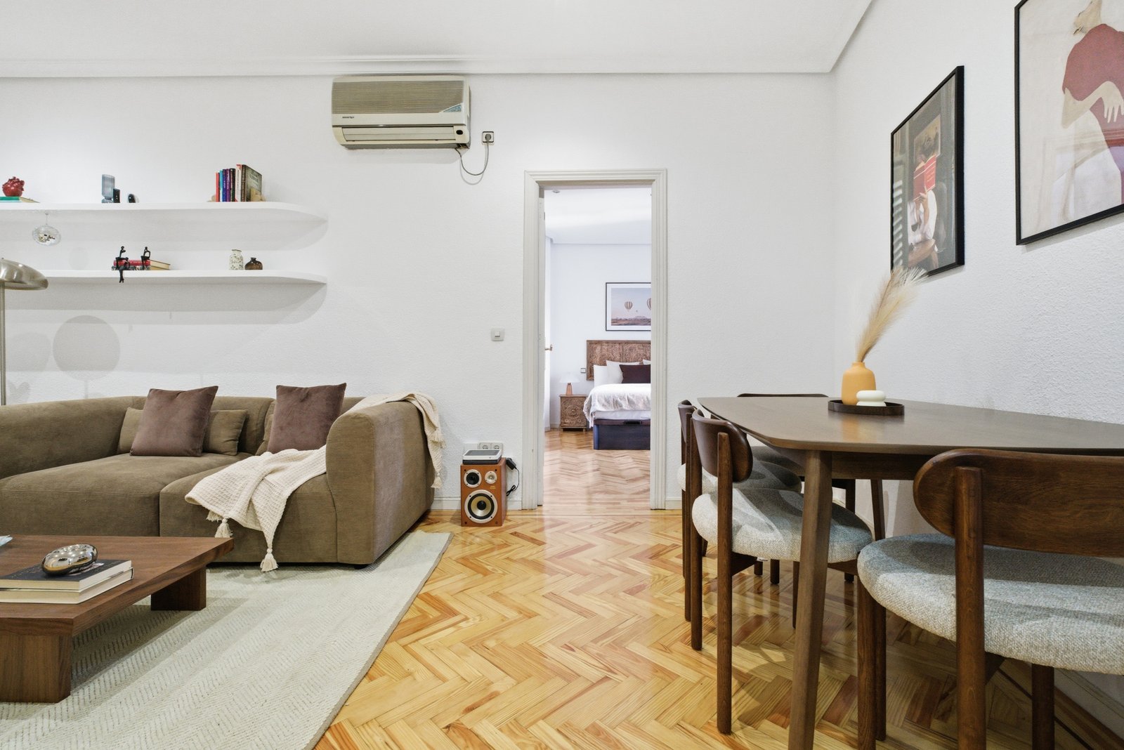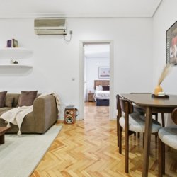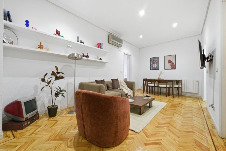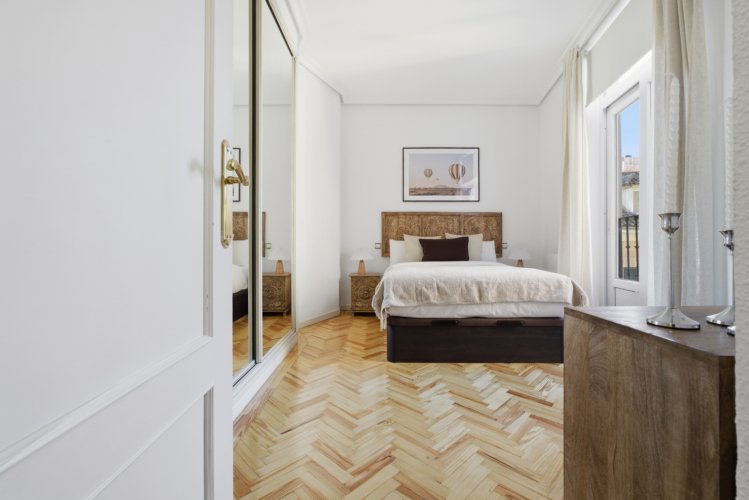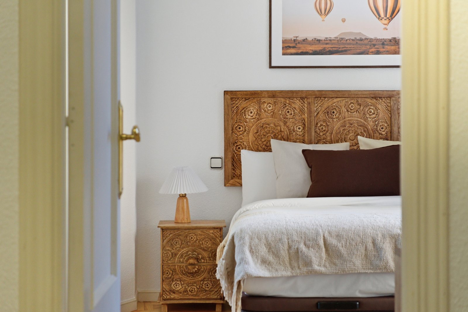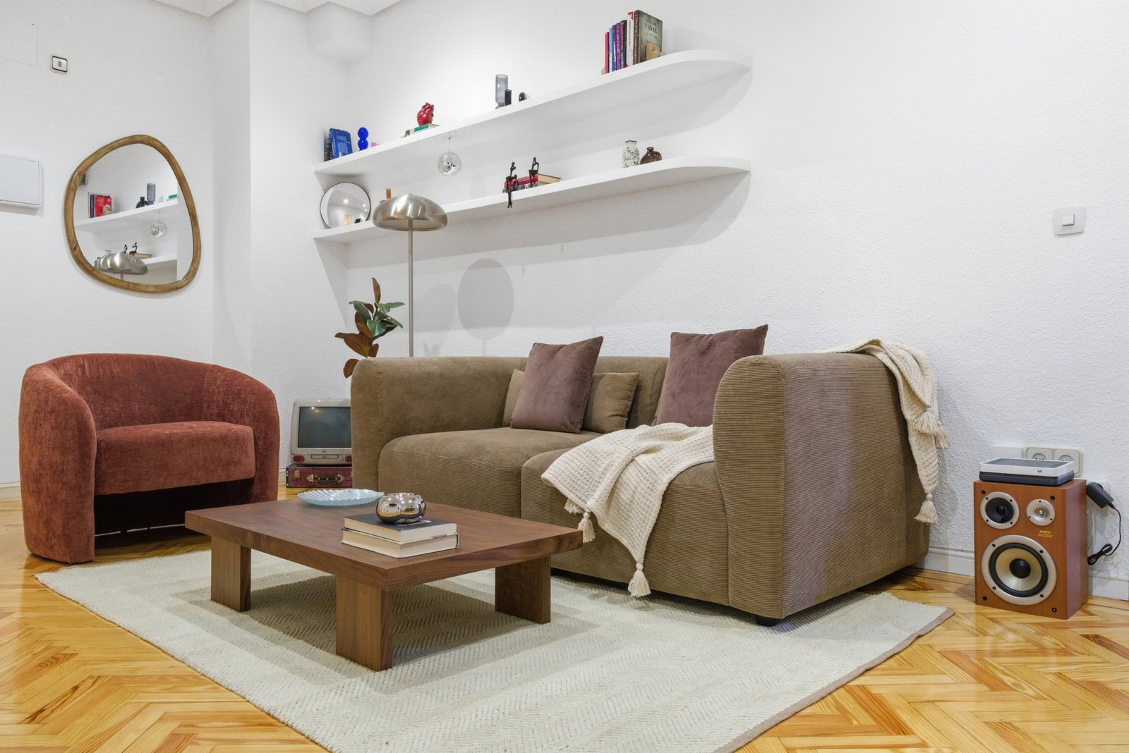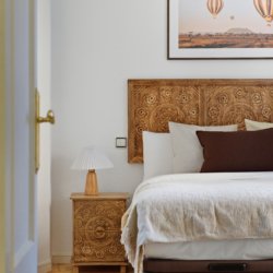 Disfruta de un apartamento cálido y con mucho encanto, en un edificio clásico del centro histórico de Madrid. Suelos de madera en espiga, muebles tallados y una decoración boho boutique crean un refugio perfecto para descansar después de vivir la ciudad.