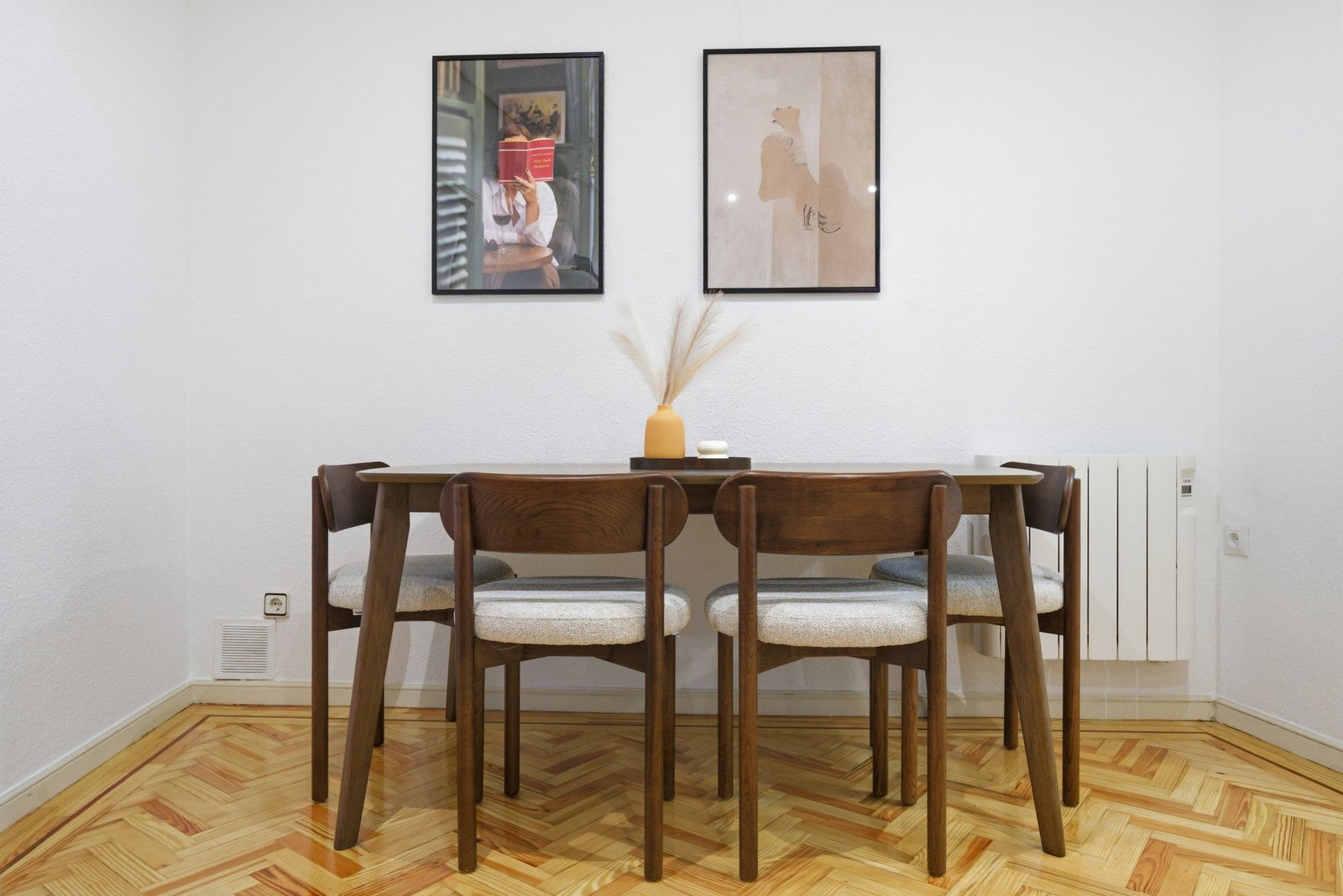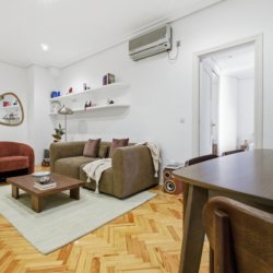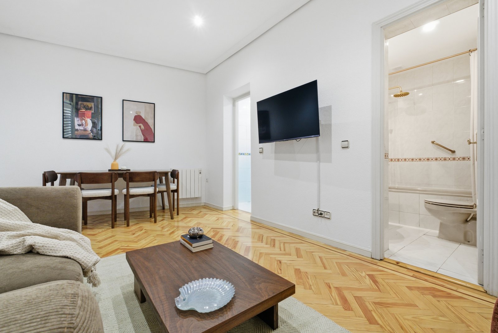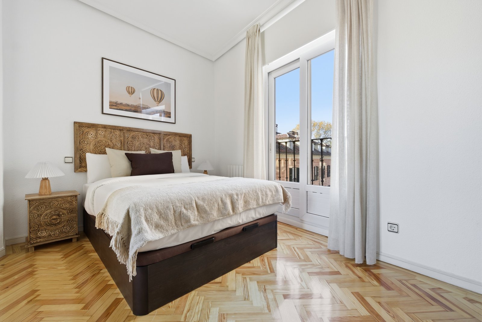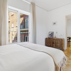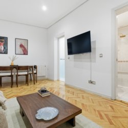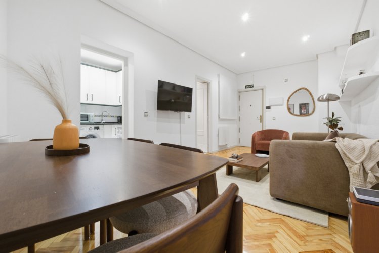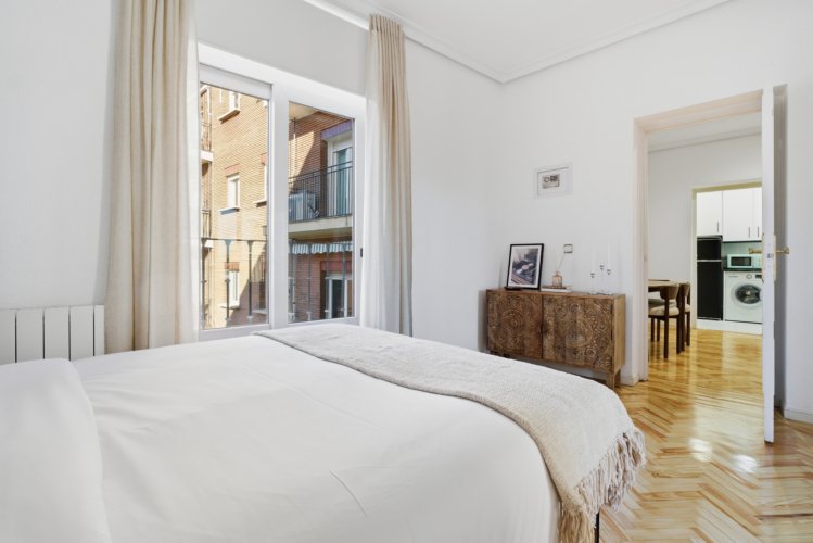 Disfruta de un apartamento cálido y con mucho encanto, en un edificio clásico del centro histórico de Madrid. Suelos de madera en espiga, muebles tallados y una decoración boho boutique crean un refugio perfecto para descansar después de vivir la ciudad.