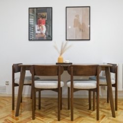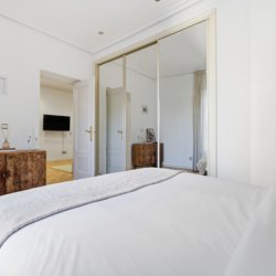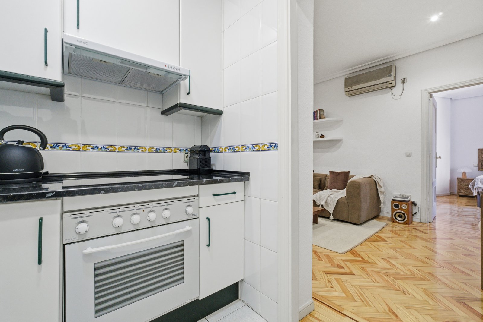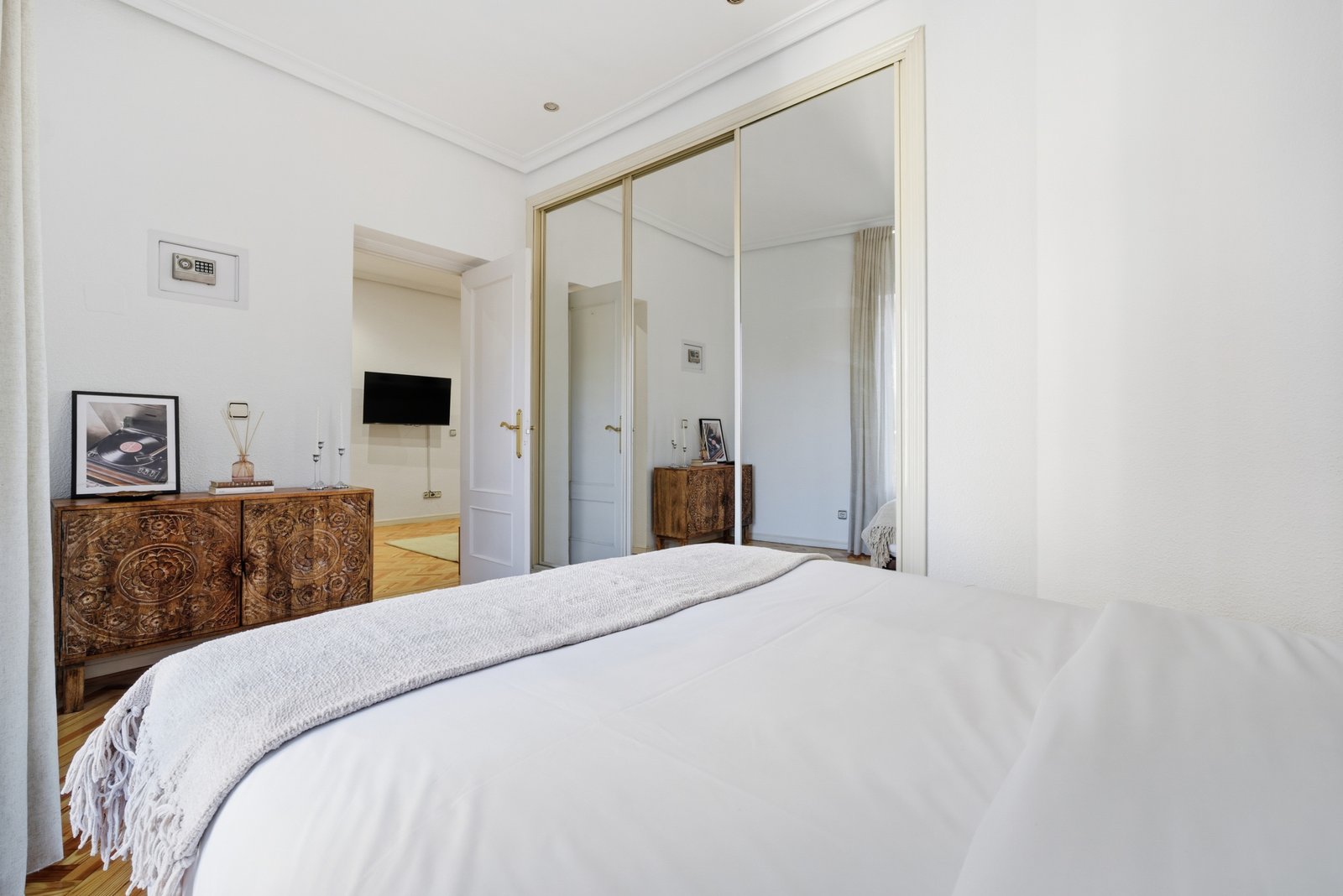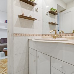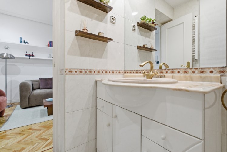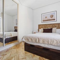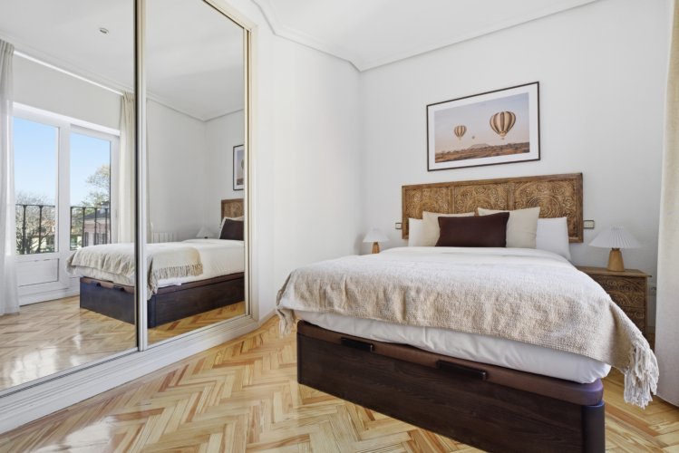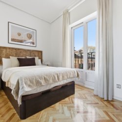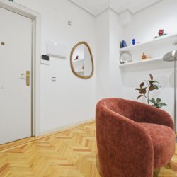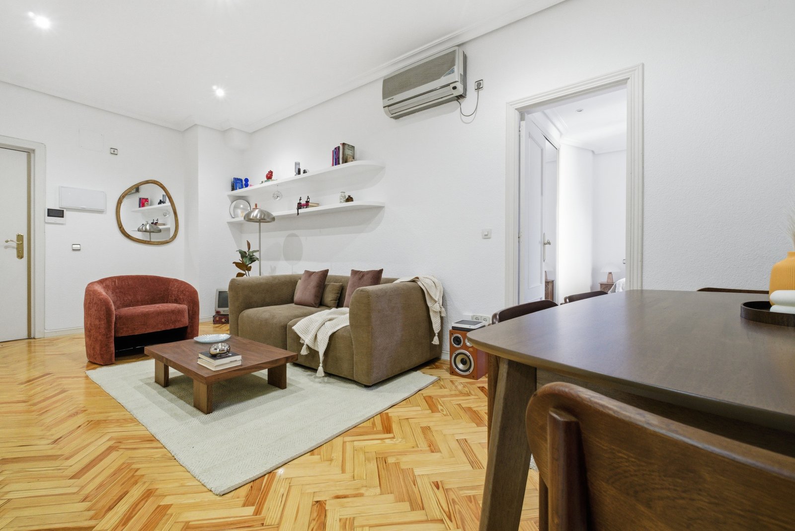 Disfruta de un apartamento cálido y con mucho encanto, en un edificio clásico del centro histórico de Madrid. Suelos de madera en espiga, muebles tallados y una decoración boho boutique crean un refugio perfecto para descansar después de vivir la ciudad.